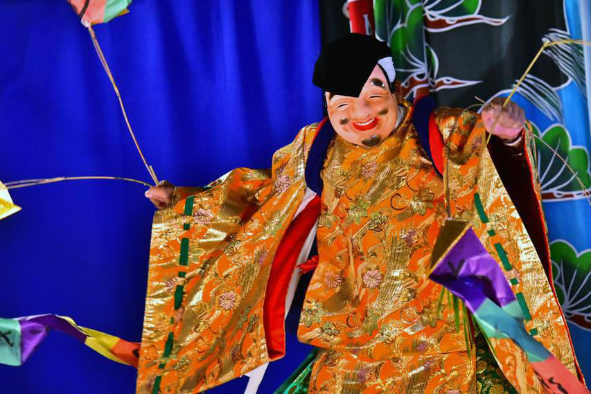五穀豊穣と天下太平を祈願して、福の神えびす様の舞です。下河内神楽団に伝わるえびすの舞は、舞の前半は「天下泰平、商売繁盛、五穀豊穣、家運隆盛、交通安全、大漁満足」の、6本の旗を持って舞、後に旗を釣り竿に持ち替えて鯛釣りの舞をいたします。6本の旗を持って舞うというのは他の十二神祇神楽団では「旗舞い」という独立した演目で舞われていますが、当神楽団ではいつの頃からかえびす舞のなかで舞われるようになったものと思われます。また、えびす様が歩んでこられる足の運びも独特の調子を踏む特徴のあるもので先代より受け継いだ貴重な技であり後世へと確実に受け継いでいかなければならないと感じております。