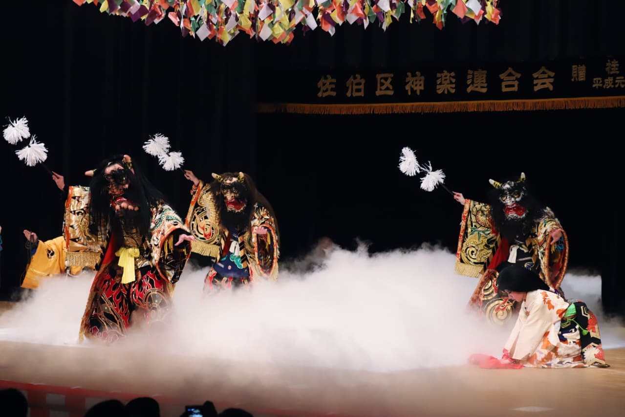 下河内神楽団の大江山は山に足を踏み入れてからの物語を演じており三者の化身などの登場はありません。主に酒呑童子と頼光主従の扮する山伏の問答、酒宴、酔った酒呑童子が自分の生い立ちを語って聞かせる口上などに力を入れてこの神楽の見どころとなるよう努力精進しております。